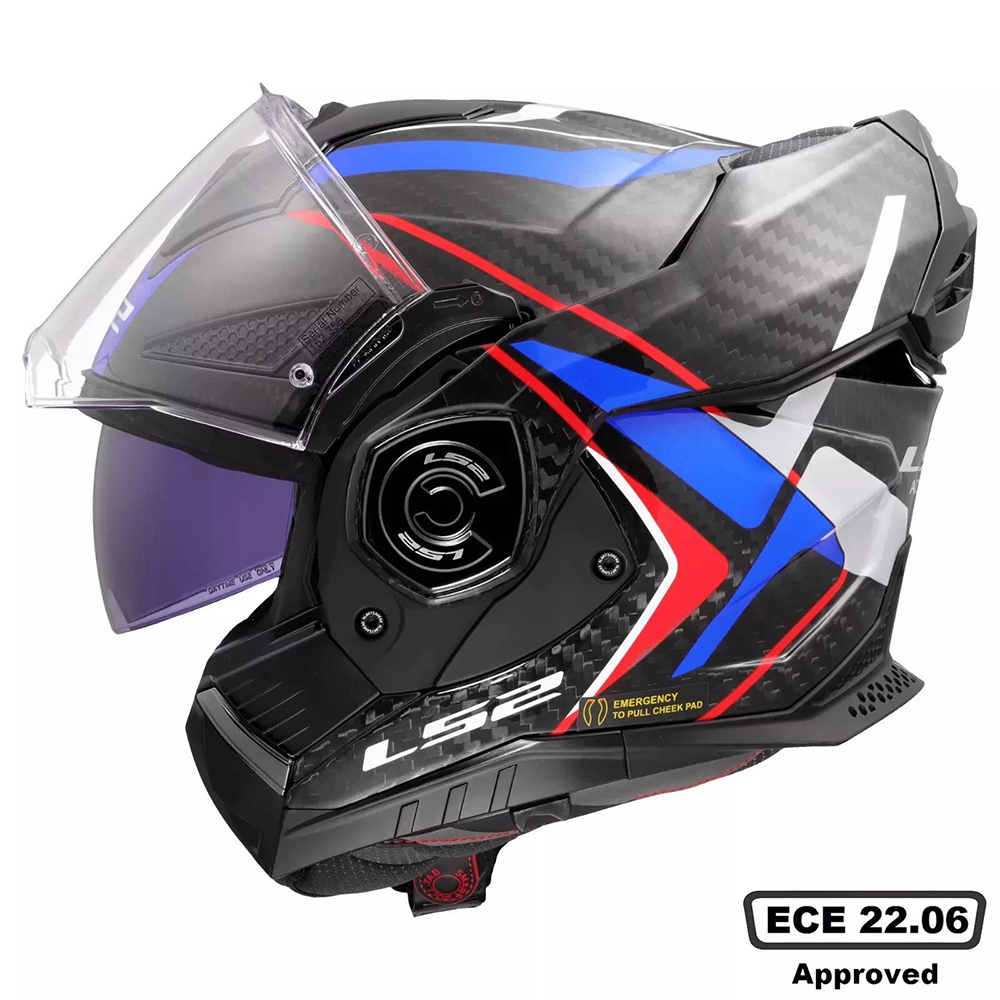 The LS2 FF901 Advant X Carbon motorcycle helmet is the ideal option for you, no matter where you are or where you go—in the city or on the wide road! The Advant X carbon is a highly adaptable high-performance helmet with a wide-weave carbon fibre structure that is specific to LS2. This construction results in an incredibly light and sturdy shell. a ground-breaking 180-degree swing-around chin bar that enhances lateral view and gives you added confidence while riding. The extremely light (1550 grammes) modular motorcycle helmet enables you ride as you and the British weather want you to, since it is approved as both a full face and an open face helmet. Available in a variety of colours and designs to complement your bike, accessories, and style.